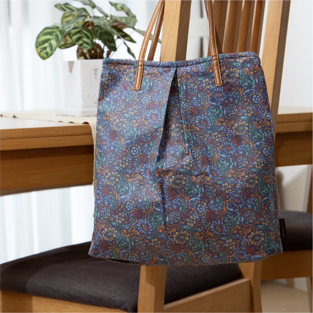 更紗柄をモチーフにした生地にコーティング加工を施したトートバック。